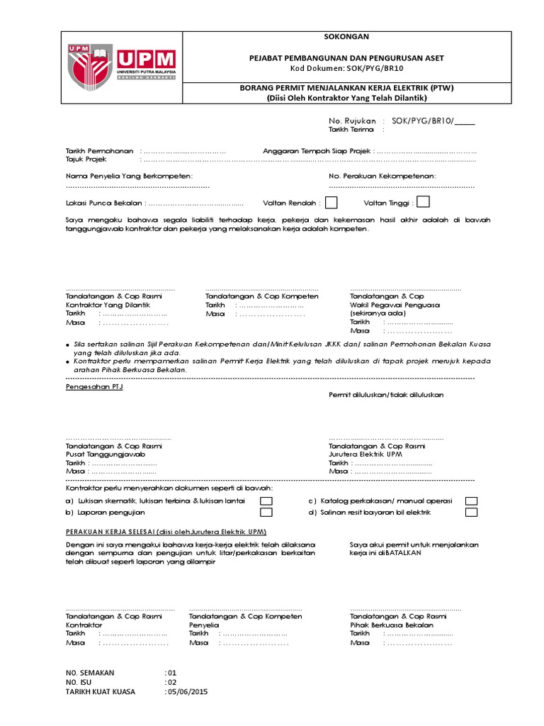 Borang Permit Menjalankan Kerja Elektrik Ptw 05062015 Pdf